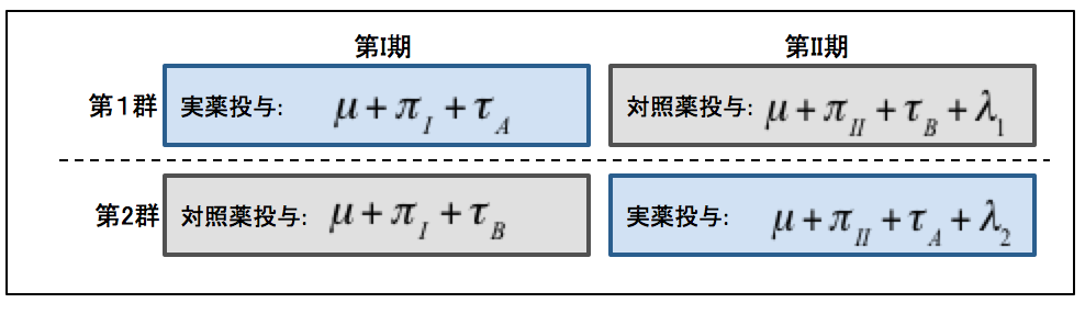 対照に対する実薬の効果を示すための比較試験ですが、クロスオーバーデザインはこの比較を行うために実薬投与期と対照投与期ではなく、第I群と第II群の比較を行います。